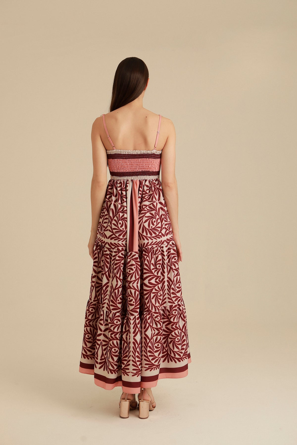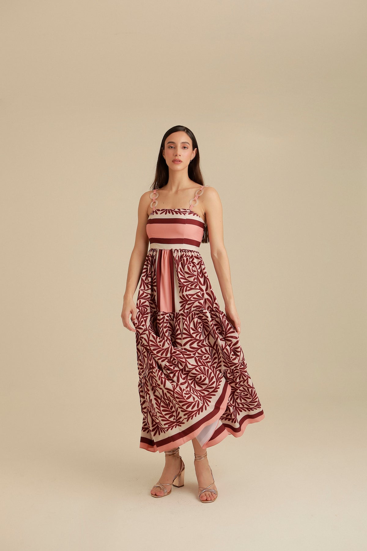 - Estampado botánico simétrico, diseñado para estilizar la figura y destacar visualmente la cintura.