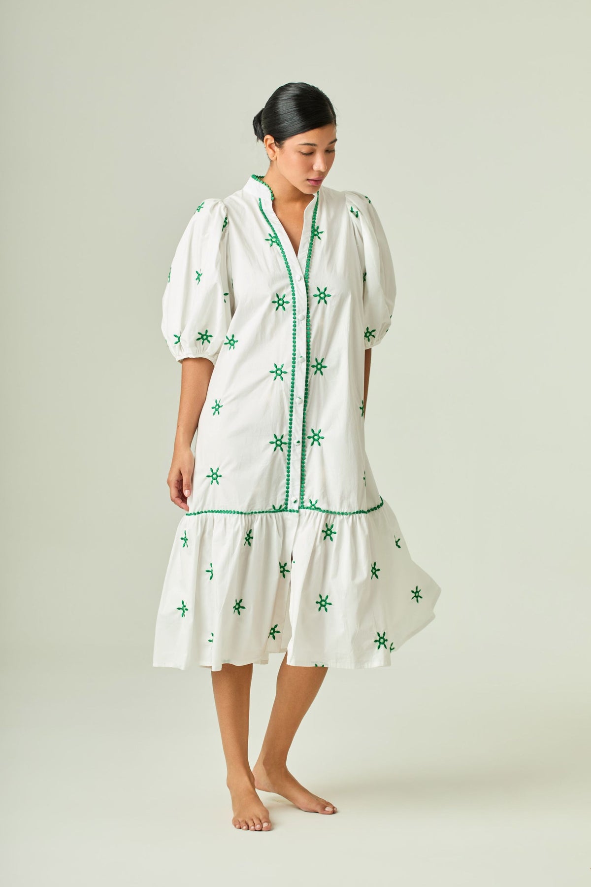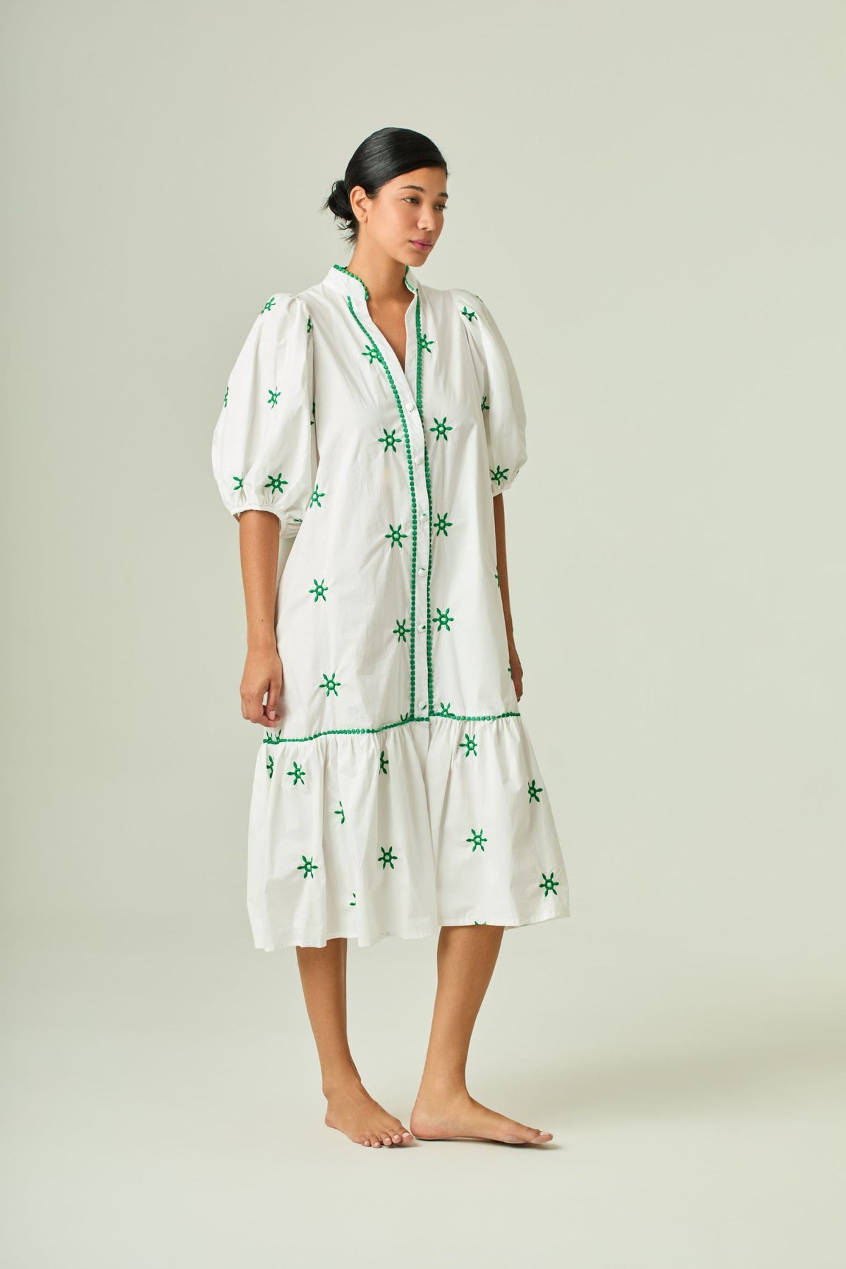 Es un vestido midi de algodón 100%, con un diseño fresco, ligero y veraniego.