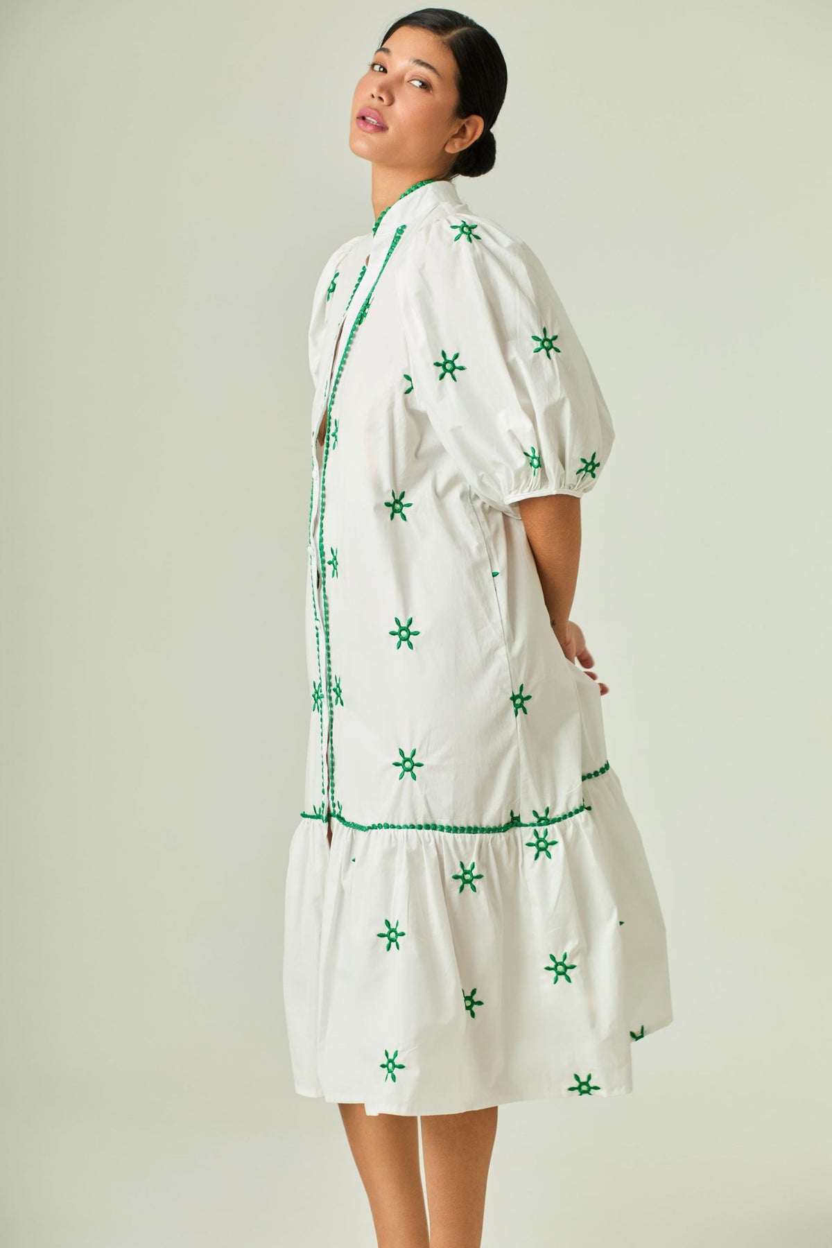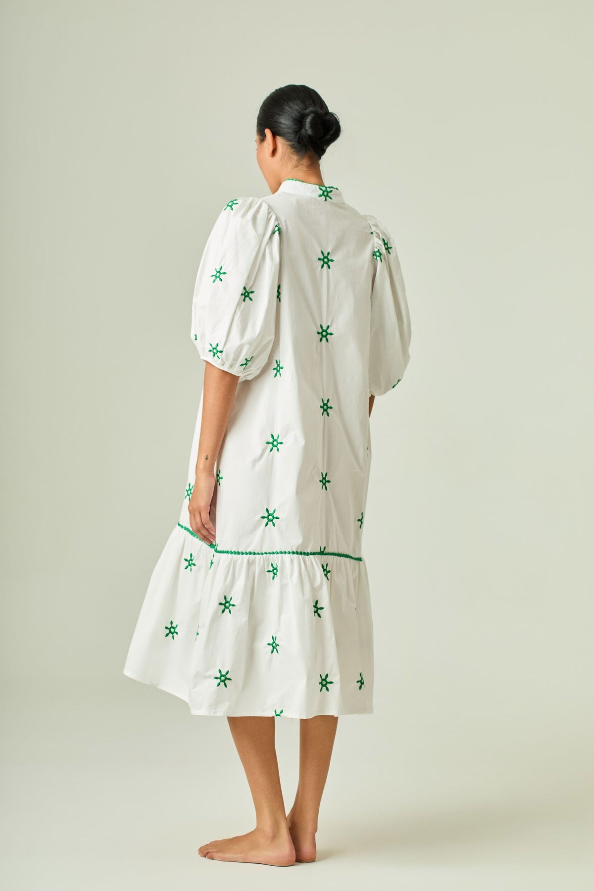 • Decoración con bordados florales/estelares en color verde distribuidos por toda la tela.
