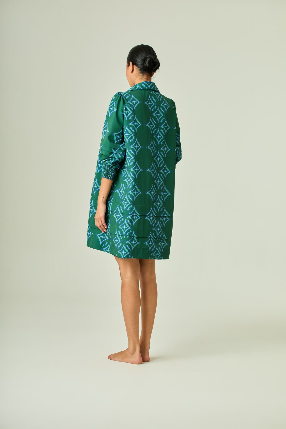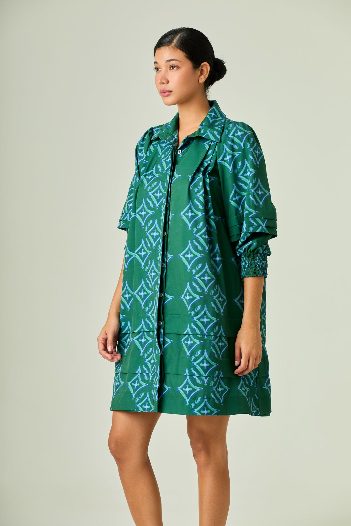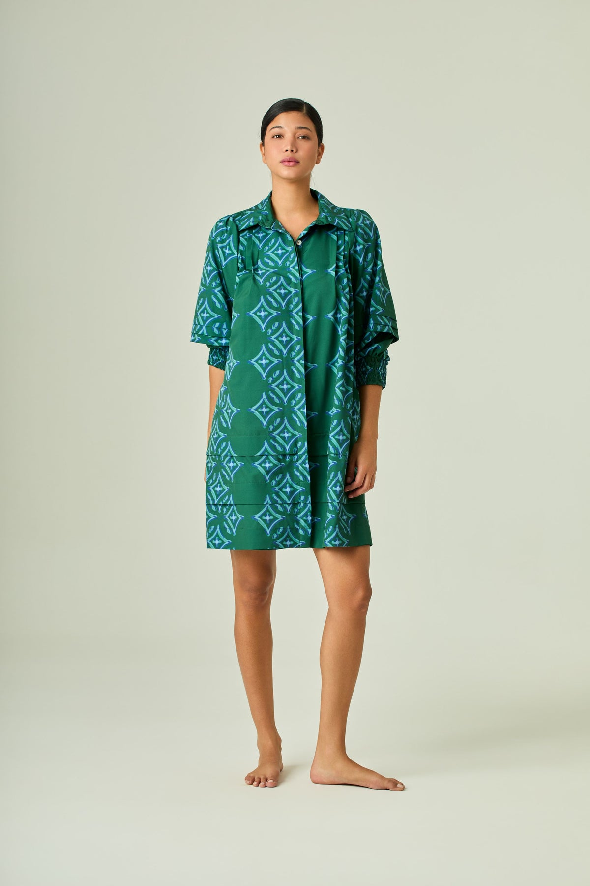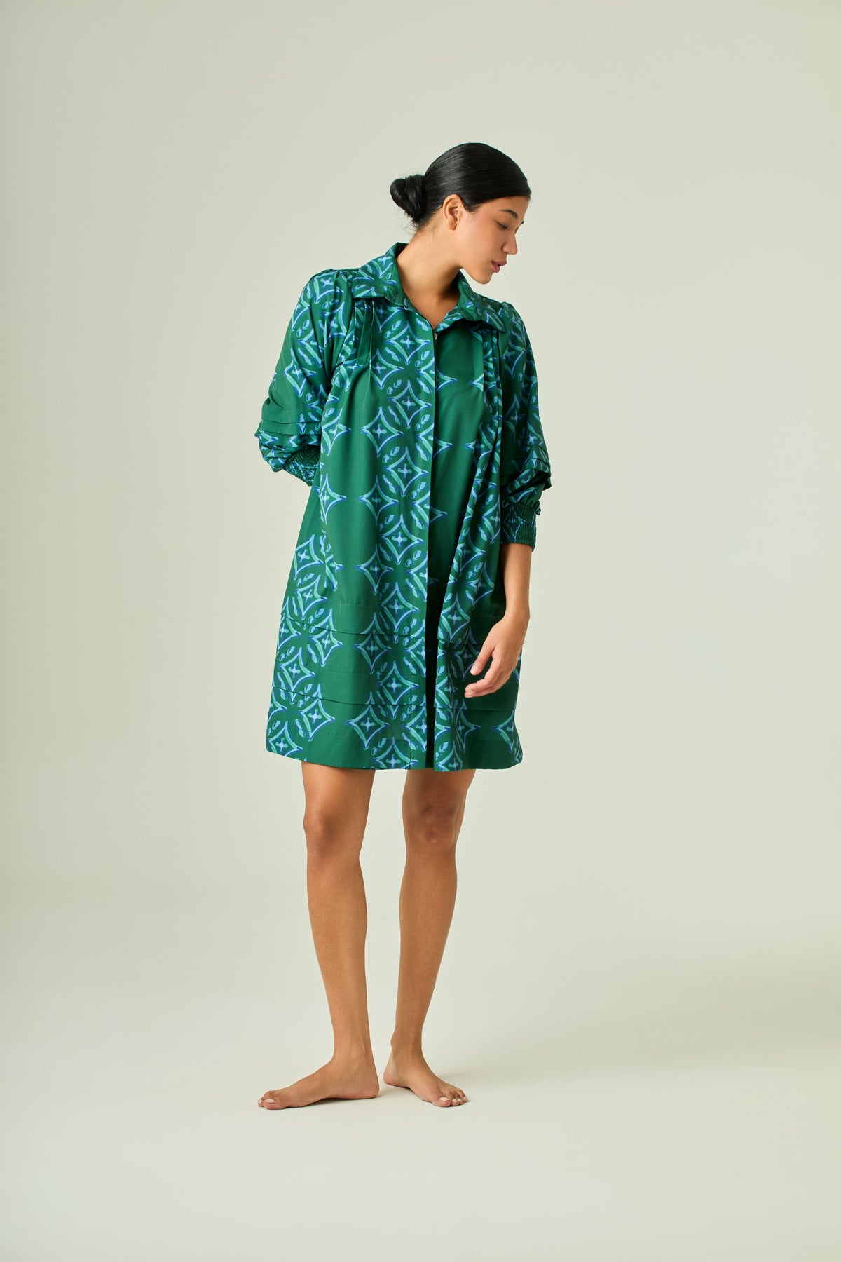 Aurora es un vestido corto de estilo moderno y relajado confeccionado en ecopoliéster, diseñado para ofrecer comodidad y versatilidad en climas cálidos. Su silueta tipo camisero amplio aporta un aire contemporáneo y sofisticado, mientras que el estampado geométrico en tonos vibrantes le da personalidad y frescura al diseño.