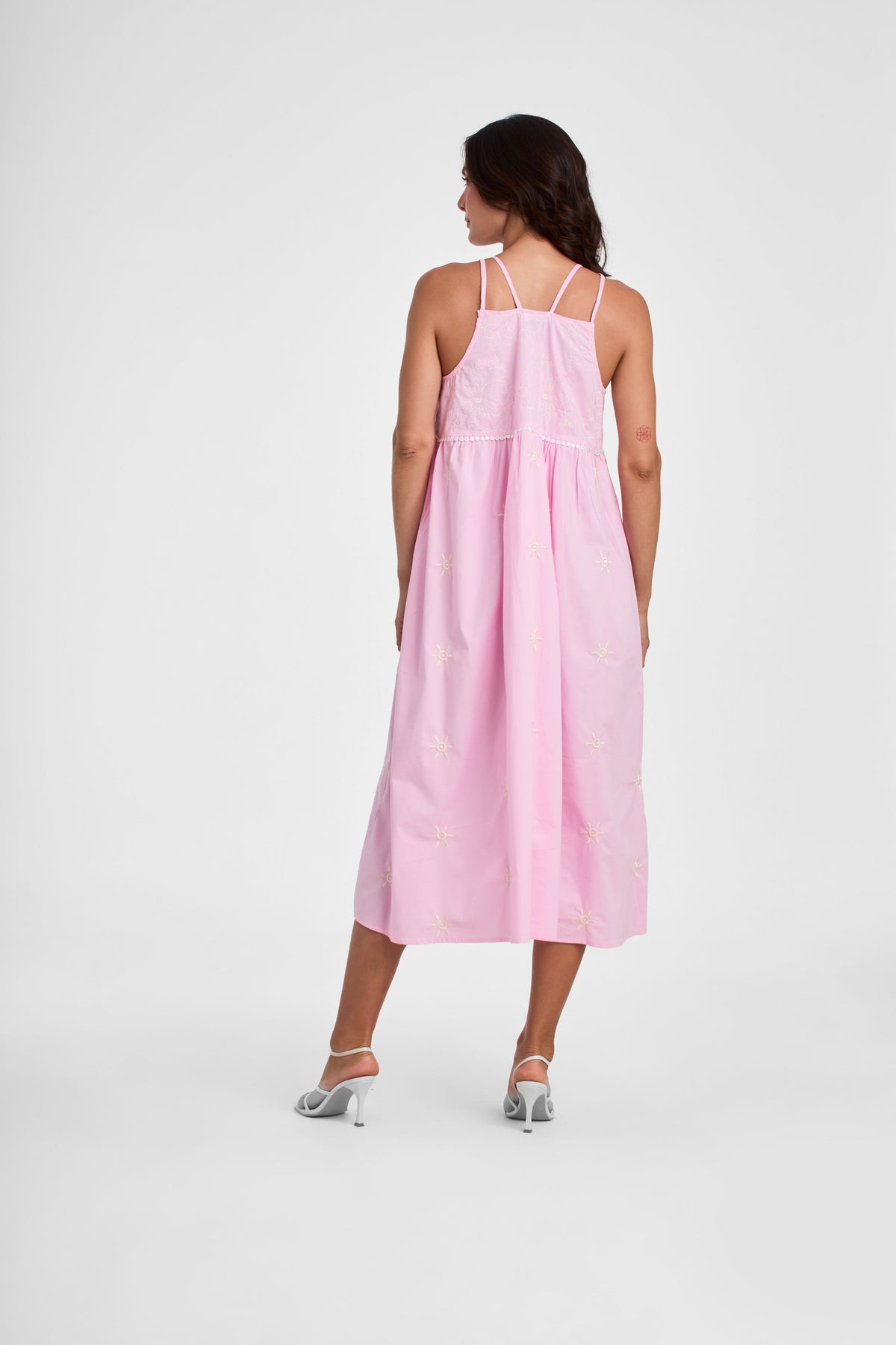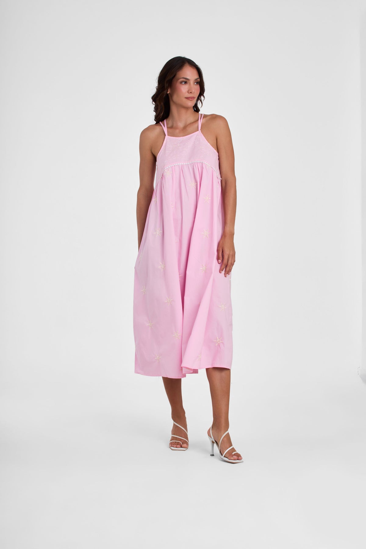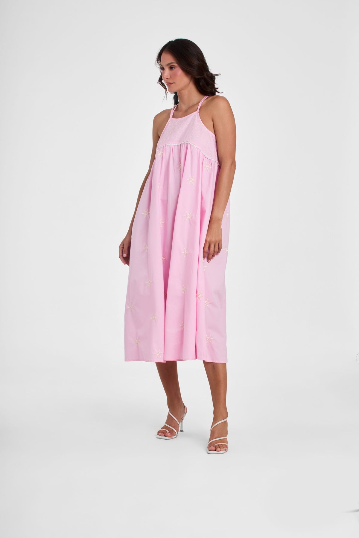 Bruna es un vestido midi de silueta holgada y amplia, estilo babydoll, en color rosa pastel.