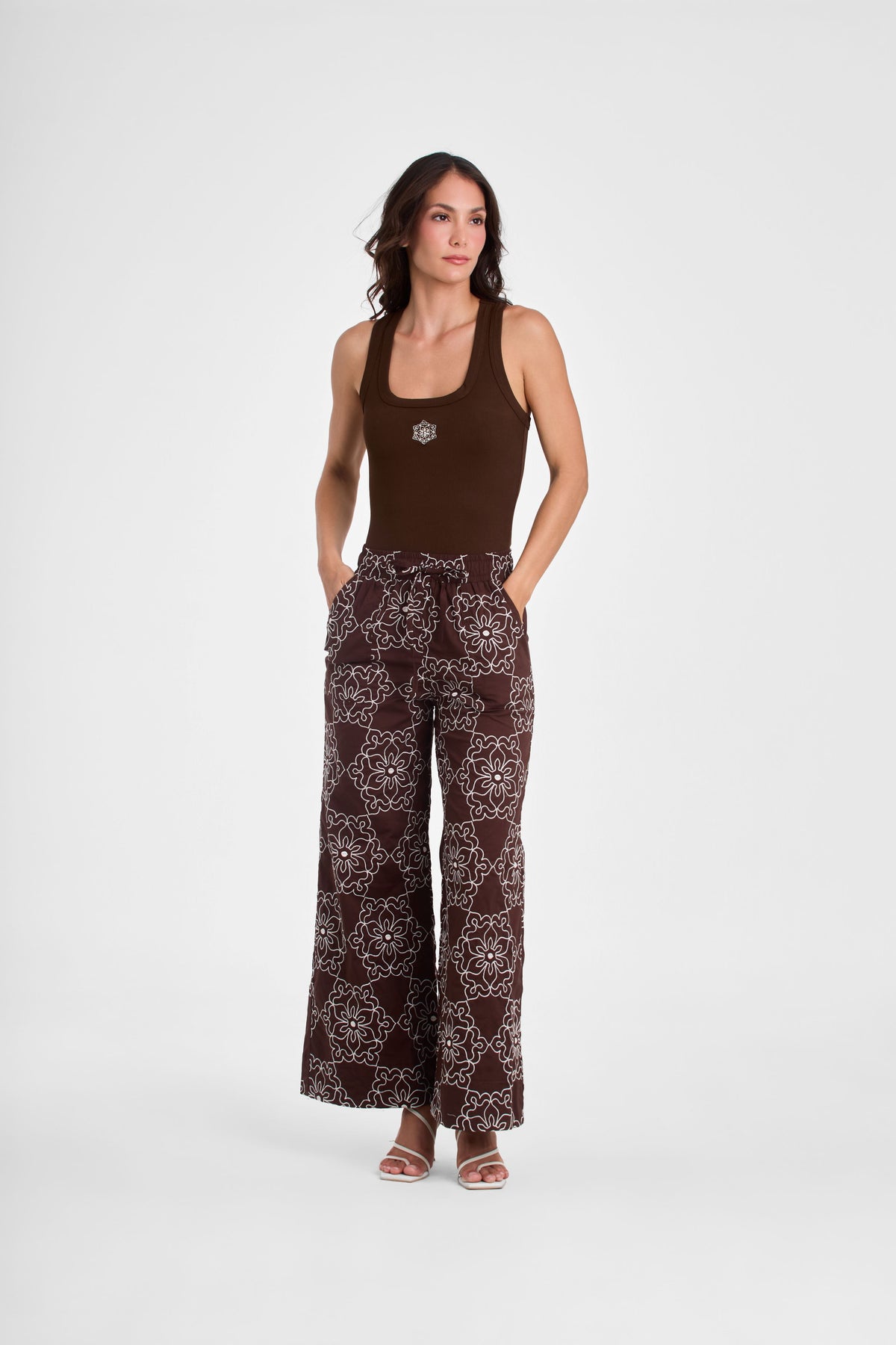 • Pantalón bordado de pierna ancha, ligero y fluido, con caída relajada.