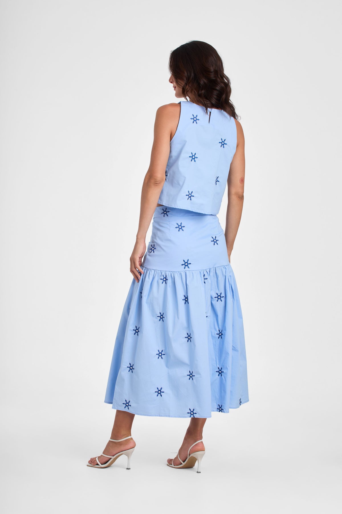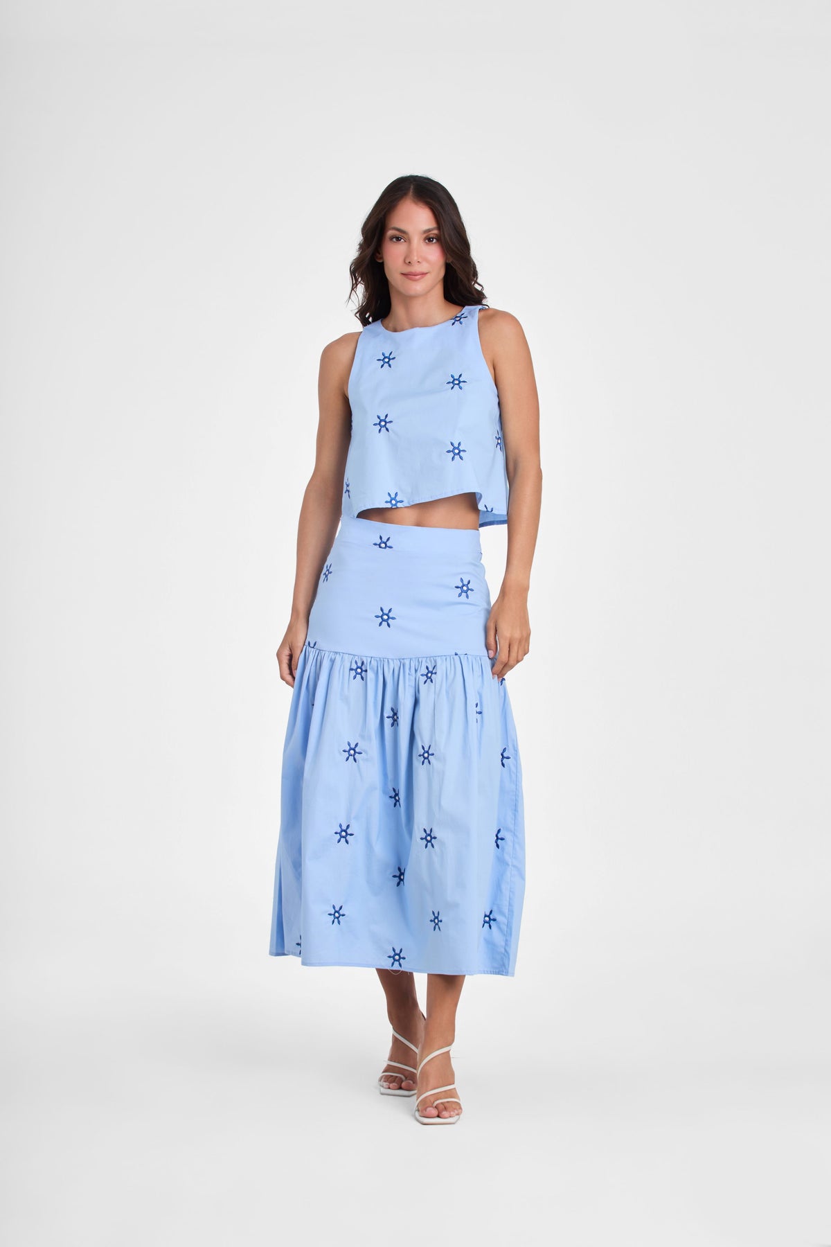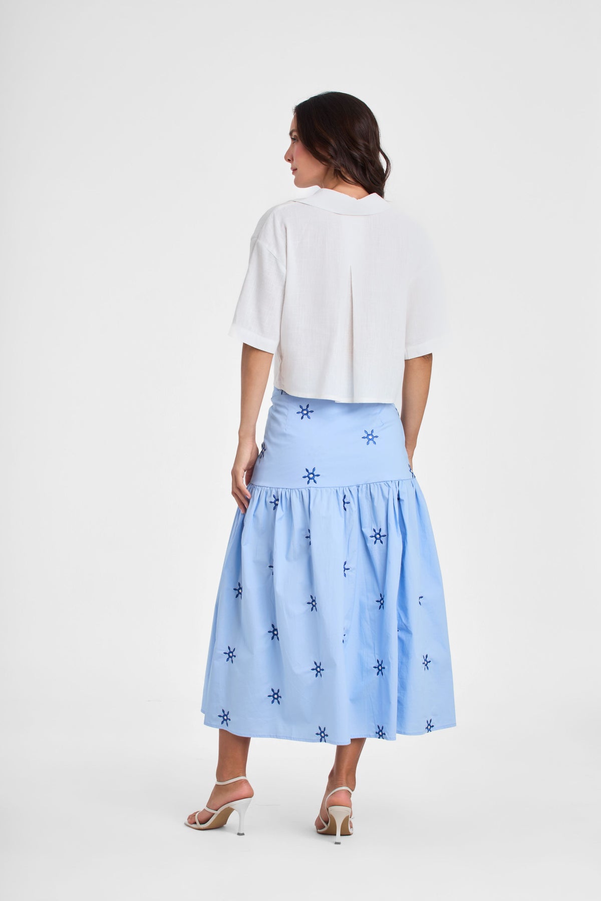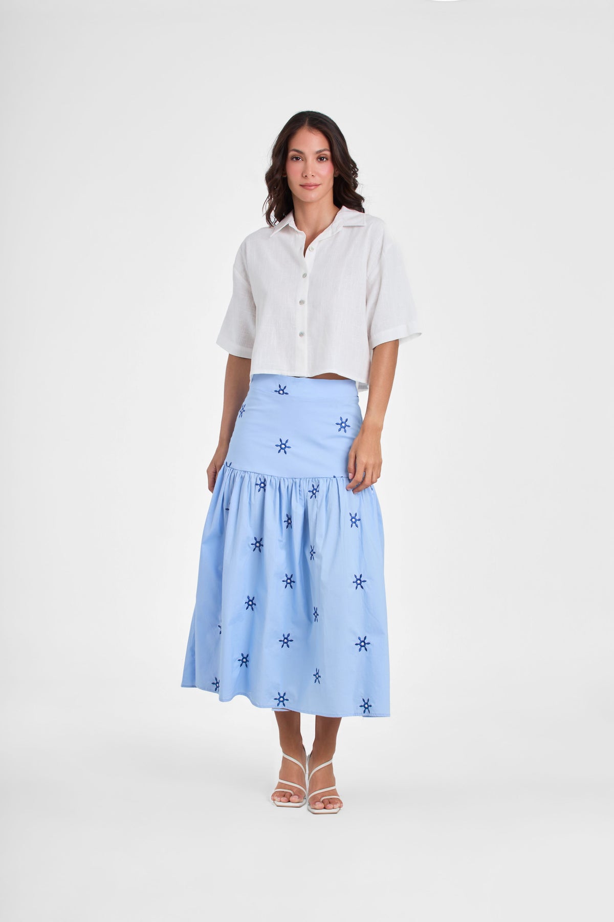 La Zoe 2 Skirt es una falda midi elegante y artesanal, confeccionada en algodón fresco y realzada con bordados que resaltan su carácter romántico y femenino. Su caída amplia aporta movimiento y un aire sofisticado sin esfuerzo.