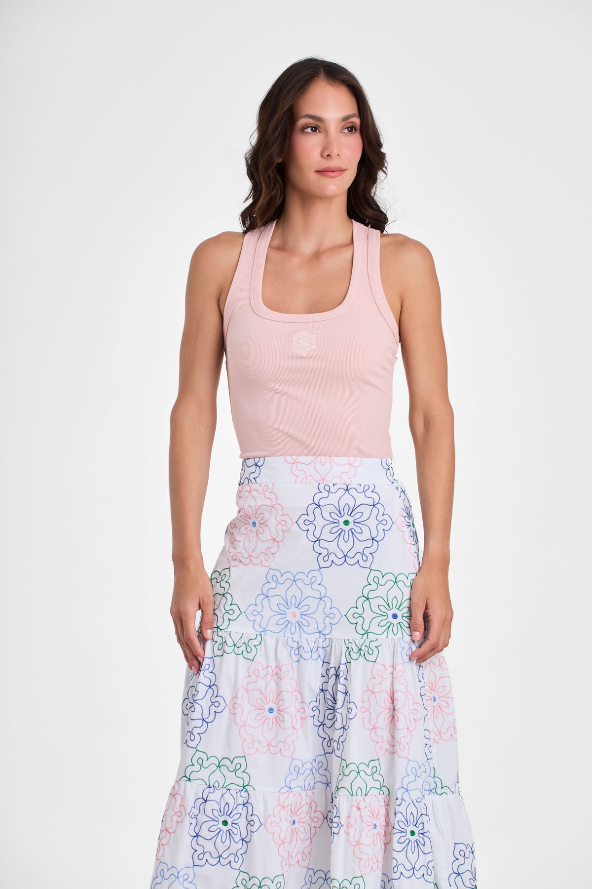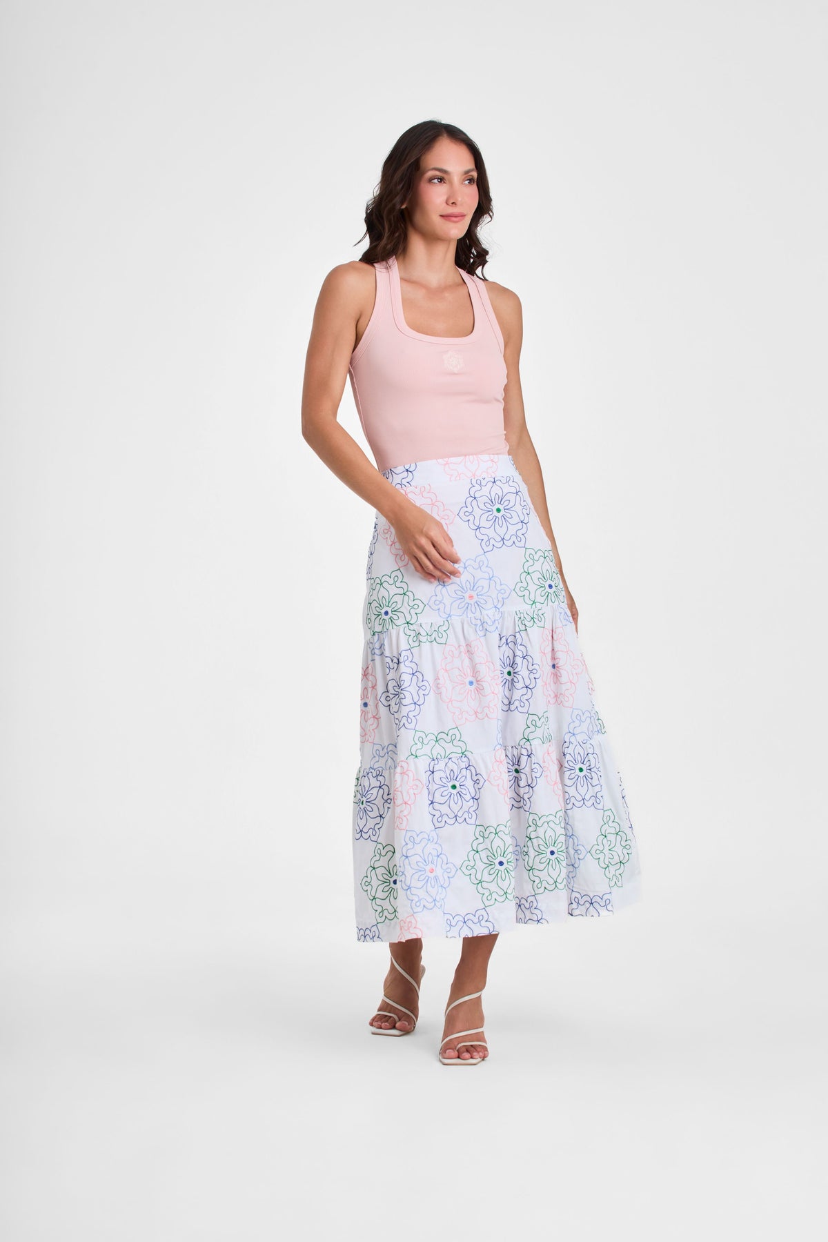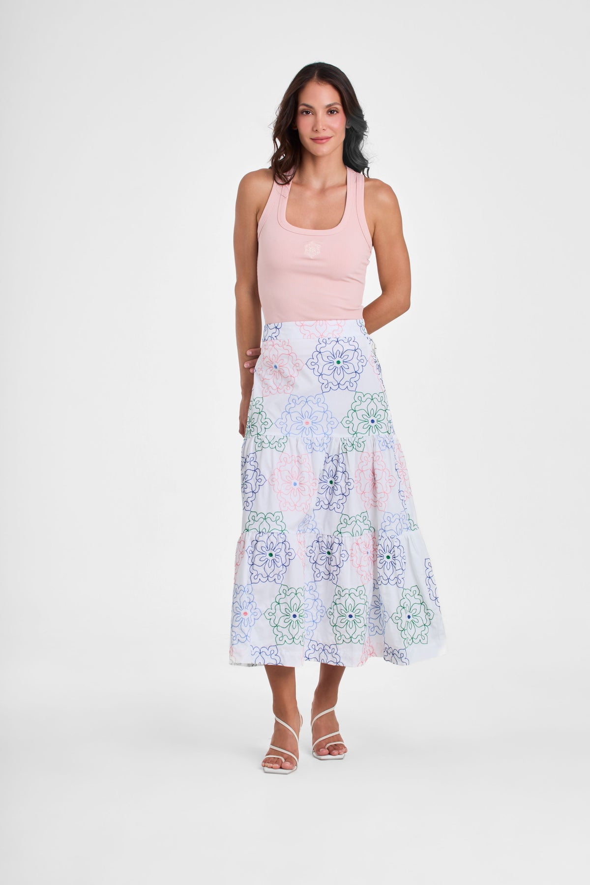 La Zoe Skirt es una falda midi elegante y artesanal, confeccionada en algodón fresco y realzada con bordados que resaltan su carácter romántico y femenino. Su caída amplia aporta movimiento y un aire sofisticado sin esfuerzo.